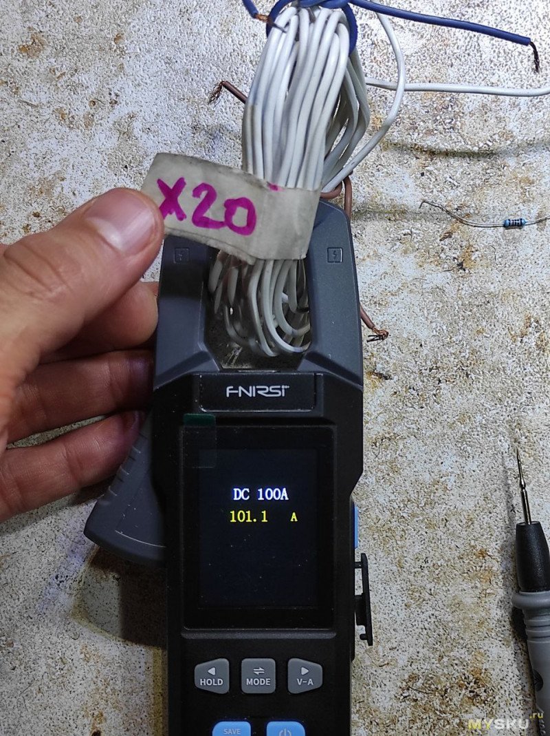 Перехожу на следующий диапазон нажатием кнопки MODE, это 100А. Подаю 5А на катушку из 20 витков, 101.1А на экране. Если нужно откалибровать по этому значению, то нужно нажать MODE.Если нужно пропустить калибровку, то нужно просто выключить клещи удержанием кнопки питания.