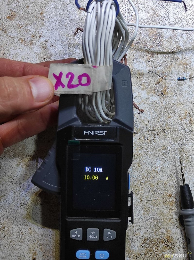 Следующий диапазон это DC10А.Для калибровки нужно дать ток 10А в захват клещей. Я дал 0,5А через катушку 20витков, на дисплее появляется 10,06А. Можно откалибровать по этому значению, можно пропустить и перейти на следующий диапазон.