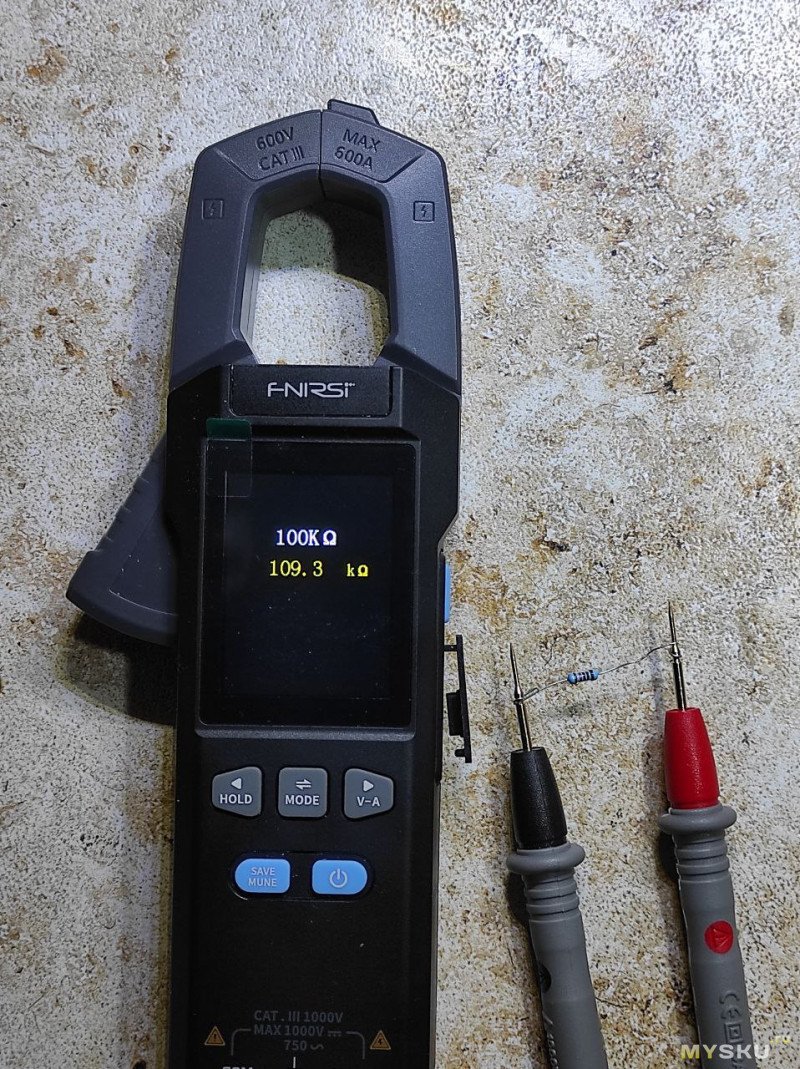 Перехожу на следующий этап нажатием кнопки SAVE. Это калибровка сопротивления, прибор просит дать сопротивление 100к. При разомкнутых щупах прибор показывает OL. Я подобрал сопротивление, которое максимально близко к 100к, подключил — показывает 109.3 к. Сохраняю калибровку по этому значению коротким нажатием на кнопку MODE, прибор думает пару секунд и показывает PA5, после этого желтое значение 109.3к должно смениться на 100.0к — калибровка прошла успешно.