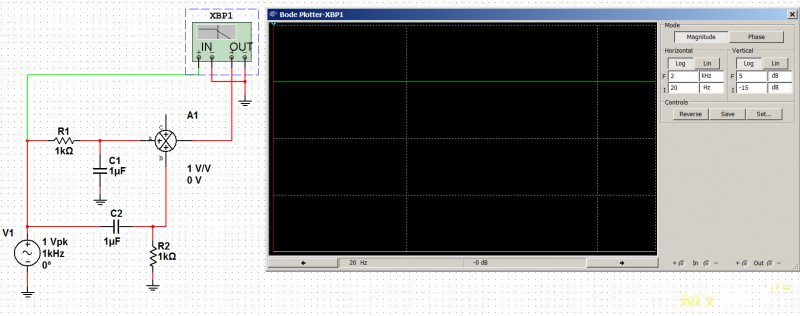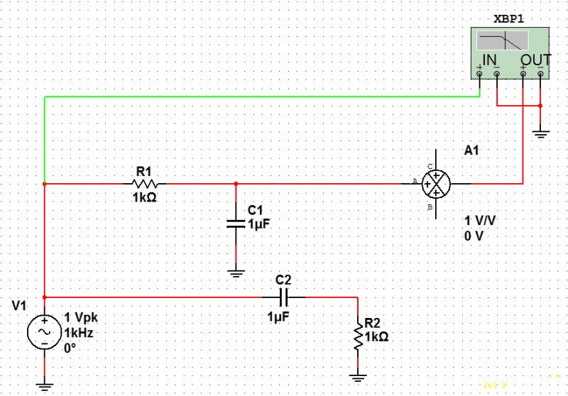 Если подключить оба фильтра к сумматору А1, то получается идеально ровная АЧХ: