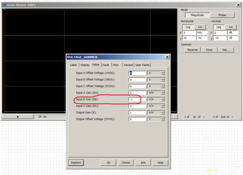 При этом коэффициенты А и В для входов сумматора установлены "+1".Теперь делаем инверсию для входа В: меняем настройку для этого входа на "-1".