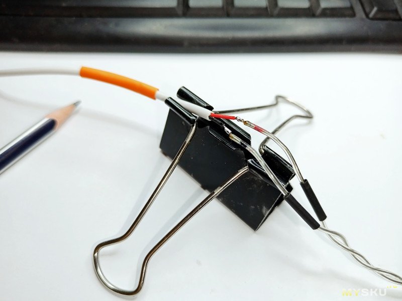 Корпус кнопки легко разбирается. Но чип на плате затерт. Пайка элементов не идеальная, но терпимая. Так как «третьей руки» у меня нет, то воспользуюсь канцелярским зажимом (биндером) в качестве держателя. Наружную термоусадку взял поярче. Под цвет апельсинки или мандаринки — как цвет новогоднего настроения )