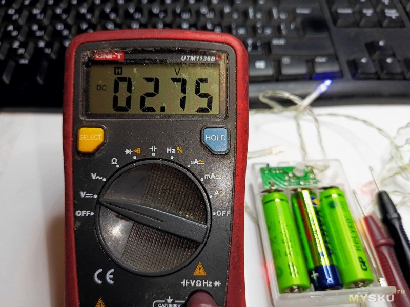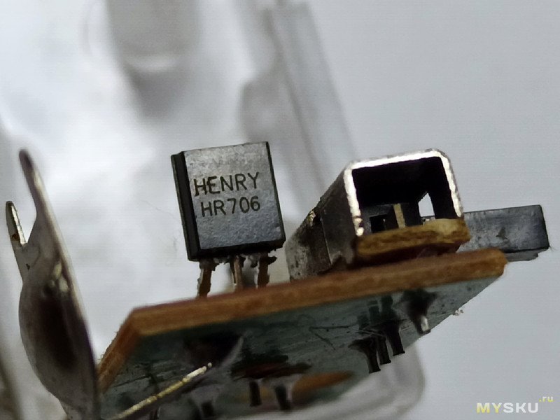 При питании от трех Ni-MH аккумуляторов выходное напряжение на плате составляет 2,75В. С обратной стороны платы установлен элемент HENRY HR706 — трёхвыводной линейный стабилизатор напряжения (LDO) в корпусе TO-92/SIP-3. Этот элемент служит контроллером питания гирлянды. Маркировка HR706 означает номинальное выходное напряжение 6В. Входное напряжение — в пределах 12...20В. Ближайший его «родственник» — стабилизатор 7806 (или7805, который выдает 5В) (зачеркнуто ввиду сомнения автора — см. комментарии).