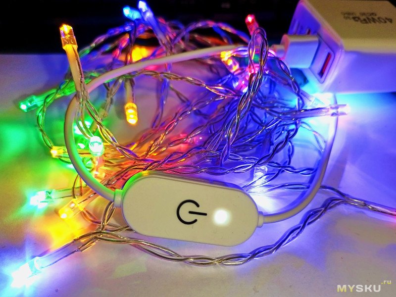 В общем, думал я недолго. У меня в закромах имелась другая LED гирлянда — белого свечения, яркая и мощная, с питанием от USB (+5В) и с управлением от сенсорной кнопки. Причем, диммируемой кнопки! На максимальной яркости эта гирлянда потребляет 1,5А, на минимальной — 100 мА.