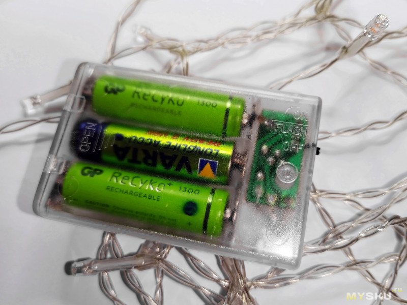 Питание — от трех батареек формата AA в пластиковом кейсе с переключателем. Можно использовать Ni-MH аккумуляторы.
