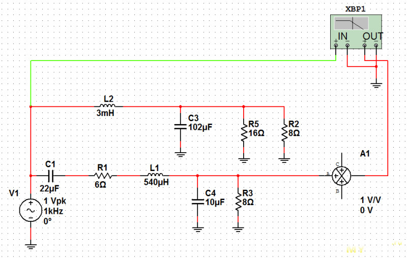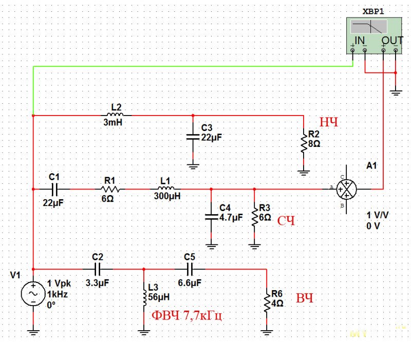 НЧ секция: применён фильтр 1-го порядка, в результате чего НЧ динамик работает до частот, где должен работать СЧ динамик. На АЧХ это выглядит во так: