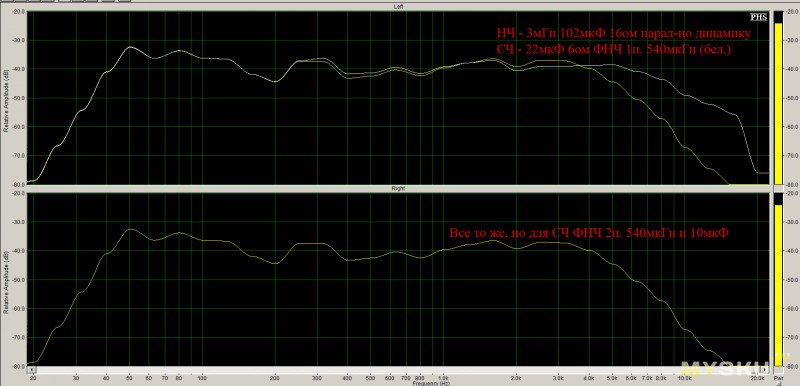 Кроме того, вылазит «бугор» на красном графике выше исходной АЧХ.Я пошёл на нечестный приём: поигрался резисторами параллельно НЧ динамику.