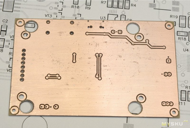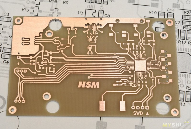 Готовая плата хоть и не очень крупная, но она мало похожа на датчик магнитометра, который обычно представляет собой тонкий щуп. Поэтому я решил сделать свою плату и перепаять на нее микросхему с китайской платы. Стремился сделать щуп как можно миниатюрней, для этого взял полоску текстолита шириной около 5 мм и толщиной 1 мм. Для микросхемы сделал в плате окно. Несколько конденсаторов обвязки должны быть размещены в непосредственной близости от микросхемы, потому что по ним протекает значительный импульсный ток (до 1 А) катушки Set/Reset. Использовал SMD-конденсаторы размера 0603, для них в плате выфрезеровал углубления. Соединить все это печатными проводниками не получилось, поэтому для монтажа использовал тонкий обмоточный провод в эмалевой изоляции. Сборку платы датчика производил под микроскопом, что оказалось довольно трудным делом.