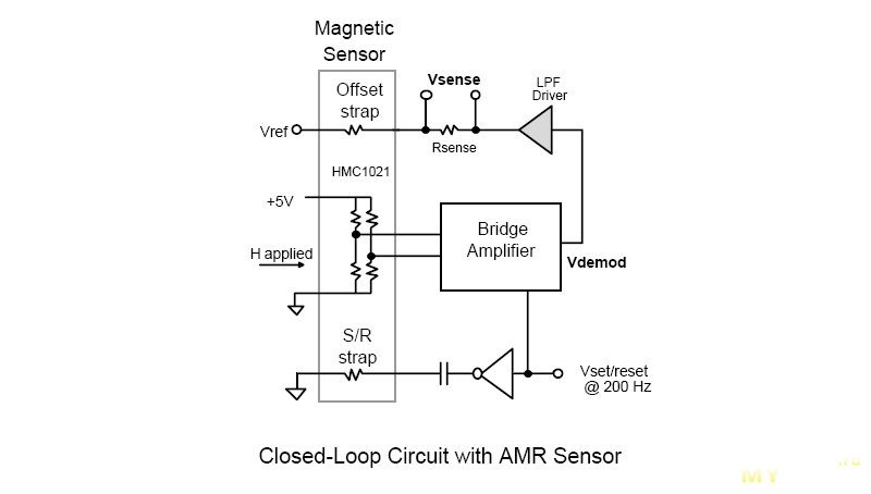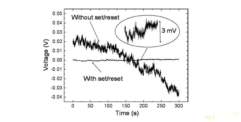 Направление намагничивания пленки можно поменять на противоположное, тогда и чувствительность к внешнему полю получится противоположная. Это используют для компенсации смещения и его температурного дрейфа, а также для снижения уровня фликкер-шума. Измерения проводят по очереди с прямой и обратной намагниченностью, подавая перед измерением на катушку сначала импульс «Set», потом «Reset». Затем берут разность выходных напряжений моста. При этом компенсируется не только смещение и дрейф самого моста, но и усилителя.