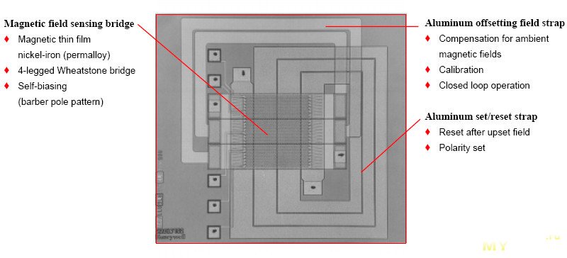 Магниторезистор в виде пермаллоевой пленки меняет свое сопротивление не только от приложенного магнитного поля. Он также имеет большую зависимость сопротивления от температуры. К тому же, при изготовлении получается большой разброс сопротивления от экземпляра к экземпляру. Что делает такие одиночные резисторы практически бесполезными. Чтобы скомпенсировать ошибки, из четырех магниторезисторов собирают мост. На одну диагональ подают питание, с другой снимают сигнал. Поскольку все магниторезисторы размещены на одной подложке, их температура одинакова, дрейф выходного напряжения компенсируется. Разброс также получается меньше, потому что резисторы изготавливаются в едином техпроцессе.