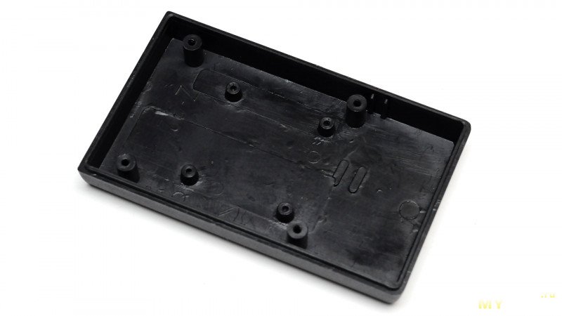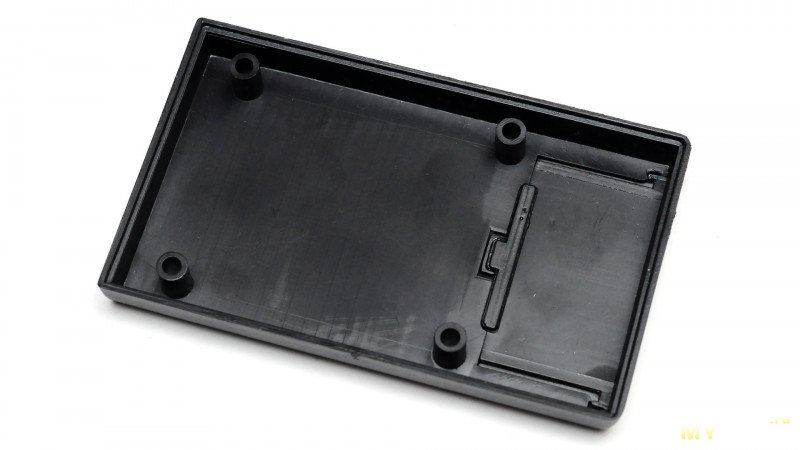 Обычно подобные аккумуляторы крепят на плату или на заднюю стенку корпуса с помощью двухстороннего скотча. Но мне это показалось неправильным, поэтому я изготовил салазки, в которые вставляется аккумулятор. В качестве основы взял обломок крышки коробки от компакт-диска. Салазки приклеил к задней стенке корпуса.