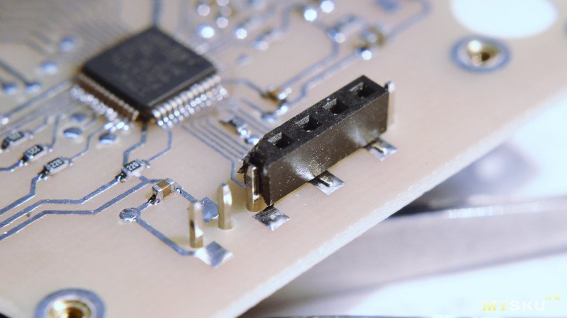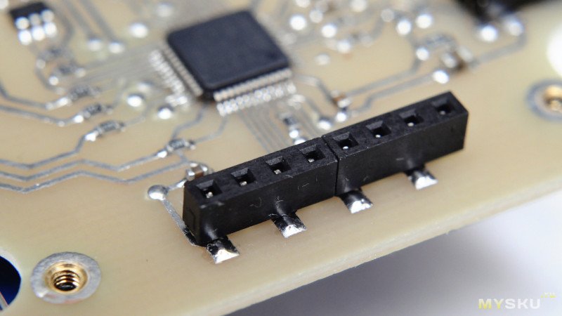 Купленный разъем имел другое количество контактов, пришлось составлять его из двух частей, обрезав лишние контакты. На фото ниже показан этот разъем: он припаивается к площадкам платы, а под ним в плате проделаны отверстия для штырьков. На последнем фото показана примерка этого разъема, там всё это видно фактически в разрезе.