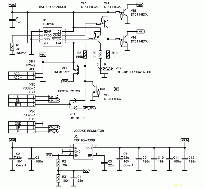 Джойстик подключается через разъемы XS5, XS6, общий вывод его кнопок подключен к земле. Кнопки LEFT, RIGHT, UP, DOWN подключены напрямую к портам процессора. А центральная кнопка BTN через диод Шоттки VD1 подключена к схеме включения питания. При нажатии этой кнопки открывается транзистор VT1, который подает напряжение аккумулятора VBAT на вход EN стабилизатора U2. Стабилизатор при этом включается и подает напряжение питания на всю схему. Но прибор по-прежнему прикидывается выключенным: дисплей не зажигается. Если в это время кнопку отпустить, то питание снова выключится. Но если кнопку удерживать дольше 2 сек., то процессор включит дисплей и откроет транзистор VT2, который будет удерживать питание включенным. Если теперь кнопку отпустить, прибор останется включенным. Чтобы эта же кнопка BTN могла делать отключение питания и выполнять какие-то другие функции, она через второй диод сборки VD1 подключена к порту процессора.