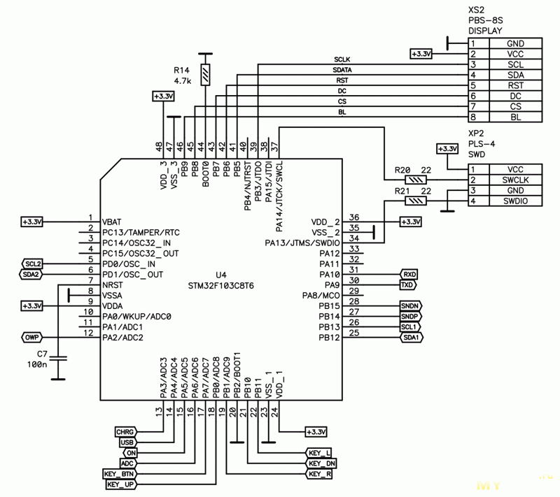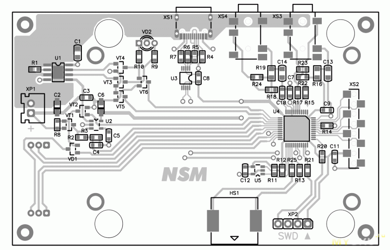 В качестве процессора использовал распространенный и дешевый 32-разрядный микроконтроллер STM32F103C8T6 (U4). Работает он от встроенного RC-генератора (HSI), тактовая частота выбрана 64 МГц. Для прошивки и отладки на плате предусмотрен разъем SWD (XP2).