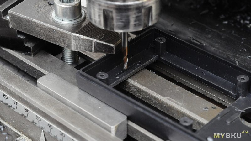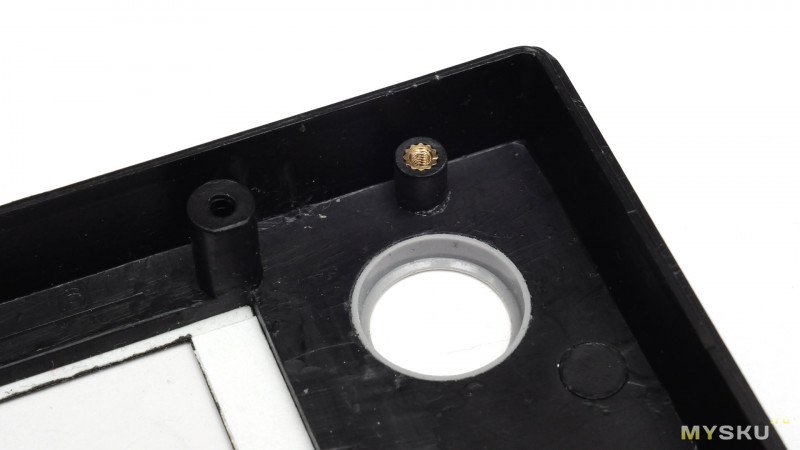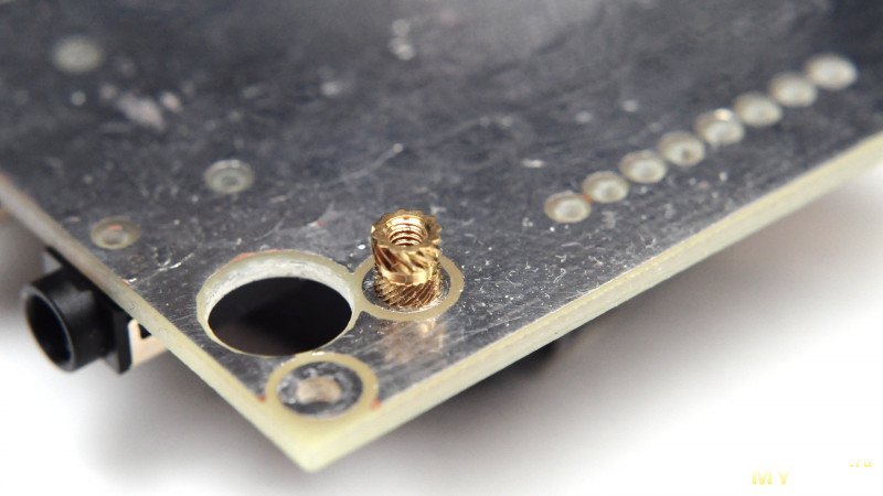 Если плата расположена слишком близко к передней панели, то есть еще одна проблема – ее невозможно закрепить на обычных стойках, так как для стоек остается слишком мало высоты. Поэтому пришлось бы мудрить с креплением, что в итоге не принесло бы никакого выигрыша. А здесь расстояние от платы до панели достаточное (6 мм), можно использовать стойки. Крепежные отверстия пришлось разместить довольно близко к краям корпуса, поэтому стойки и винты большого диаметра не помещались. Решил для крепления платы использовать винты М2, как и для крепления дисплея. Обточил пластиковые стойки до диаметра примерно 5.5 мм, а внутрь тисками запрессовал латунные втулки с резьбой М2.