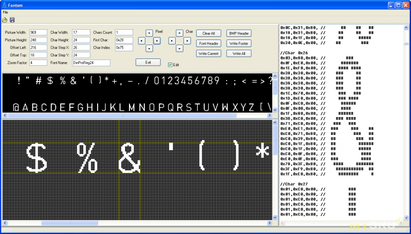 С его помощью было создано несколько шрифтов разного размера и с разным начертанием символов. Кроме шрифтов в этом редакторе можно создавать небольшие монохромные картинки (иконки).