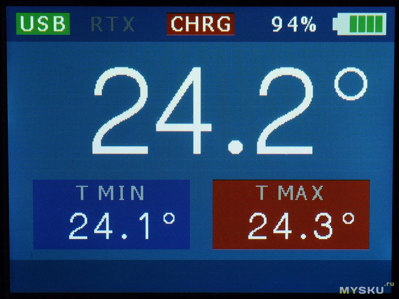 Для отображения температуры используется шрифт большого размера (высотой 72 пикселя), еще выводится минимальное и максимальное значения температуры. Сбросить эти значения можно нажатием джойстика вверх или вниз. Короткое нажатие центральной кнопки джойстика переключает режимы магнитометр-термометр.