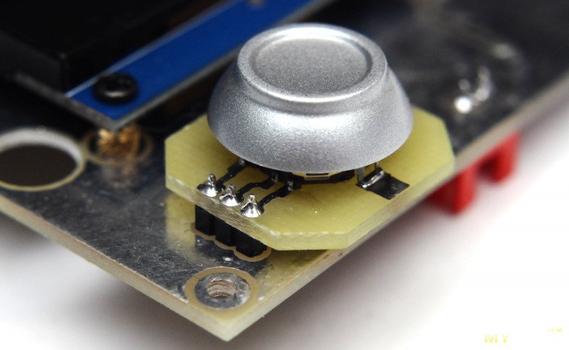 По высоте джойстик, конечно же, не совпал с дисплеем. Пришлось изготовить маленькую платку, которая впаивается в основную плату на штырьках PLS2 (с шагом 2 мм). Расстояние между платами – 2 мм. Вероятно, джойстик можно было бы разместить прямо на плате управления и согласовать с дисплеем, если бы тот был без своей платы. Но менять выбор относительно дисплея уже не хотелось.