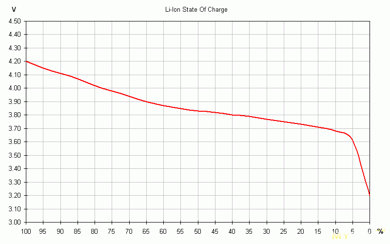 Во всех устройствах с питанием от аккумулятора, как правило, индицируется степень его зарядки в процентах. В теории, надо считать величину заряда в кулонах – сколько вошло в аккумулятор при зарядке, сколько вышло при разрядке. Но чтобы показать проценты, надо знать емкость, т.е. требуется калибровка. А это хлопотное дело, никто им заниматься не будет. Поэтому остается классический способ – определять процент зарядки по напряжению. Понятно, что это напряжение много от чего зависит (температуры, величины тока аккумулятора, его емкости, конкретного типа и т.д.), зато этот способ самый реальный. Нашел в Сети множество зарядных и разрядных графиков для Li-ion аккумуляторов, и все они разные. Взял наиболее понравившийся. В идеале, конечно, надо было снять такой график именно для моего аккумулятора и именно с моим значением тока зарядки и разрядки. Но не слишком ли много этот проект хочет?