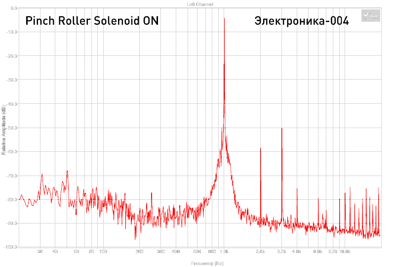 Кроме повышения уровня шума, возрастают и искажения. Характеристика намагничивания у ленты довольно нелинейная, но она симметричная относительно нуля. В результате почти не образуется четных гармоник. Искажения магнитофонов приято измерять по уровню 3-й гармоники. Но если накладывается внешнее постоянное поле, кривая намагничивания смещается вверх или вниз и перестает быть симметричной. Это вызывает появление четных гармоник. Ниже показана анимированная картинка спектра шумов канала записи-воспроизведения катушечного магнитофона «Электроника-004»: один спектр снят при включенном электромагните прижимного ролика, второй – при выключенном (ролик прижимался вручную). Видно, что поле рассеяния электромагнита заметно повышает уровень НЧ-шума, а также резко увеличивает уровень 2-й гармоники.