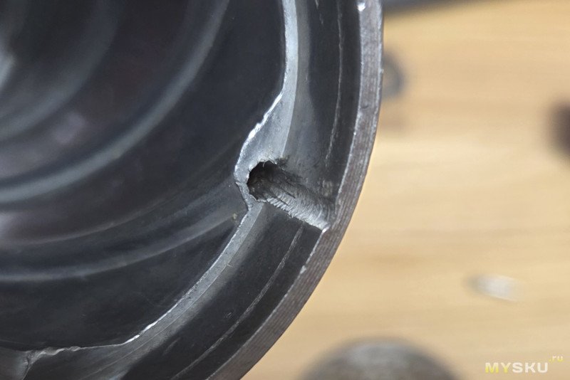 Штатный штифт имеет диаметр 3мм и посажен на 4 мм вглубь.После консультаций с батей было принято решение рассверлить и изготовить новый штифт подлиннее и потолще из хвостовика сверла. В хозяйстве нашлось сверло на 1/8 дюйма, что в метрическом виде 3.175 мм и свело на 3.3 мм. Рассверлил дюймовым, причём просверлил в глубину ещё на пару миллиметров, так, что край сверла показался внутри мясорубки, а общая глубина посадки стала 6мм. Штифт отрезал дремелем алмазным диском и фаску снял им же.