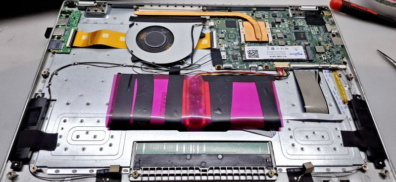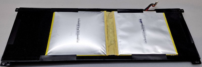 И стало жене не нужно таскать железо туда-сюда, внизу стоит один ноут, в спальне – другой, и батарея у него нормальная, можно не привязываться кабелем в постели, и экран приличный, и корпус полностью металлический, и мощности хватает на все её потребности, и продолжалось так почти два года, пока однажды он не вспух — после недели на зарядке без использования.Разбирается элементарно, только винтики совсем пластилиновые и слизываются на раз, вскрыл, достал батарею: