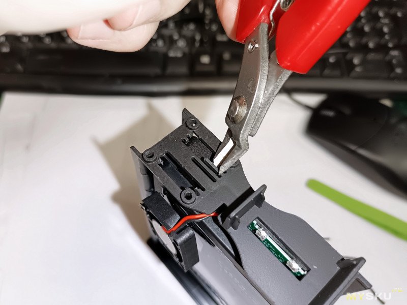 Открываются вентиляционные щели, которые изнутри закрыты поролоном. Видимо, для пылезащиты. Однако от штатных +5В кулер вообще не создает напора воздуха. В чем тогда смысл пылезащиты? Щели я расширил с помощью кусачек и скальпеля, поролон извлек.