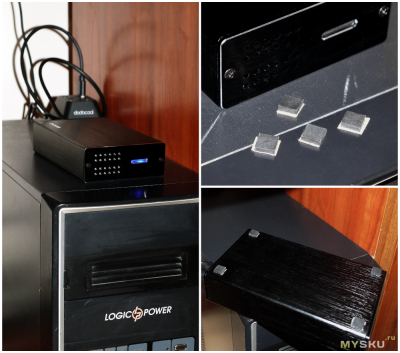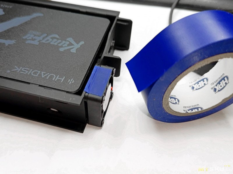 Щели вокруг кулера оклеил синей изолентой (работает только синяя!). Последний штрих — наклеил резиновые «ножки» снизу, чтобы корпус не елозил.