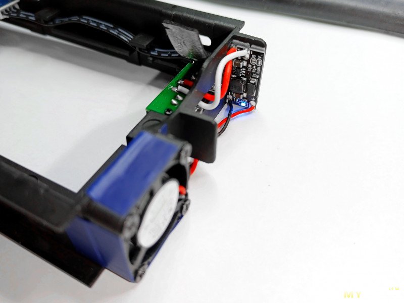 Штатные провода питания кулера подпаяны к выносной плате кейса и на ней обозначены точки подключения (M+ и M-).