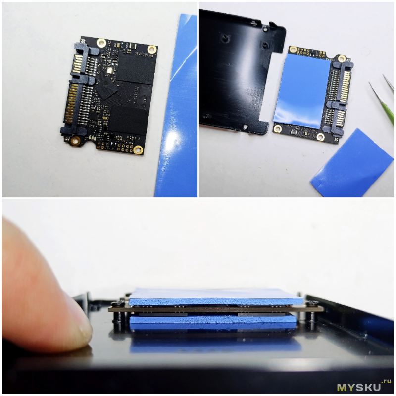 Что касается доработки KingFast 2TB. На плату контроллера с двух сторон установил термопрокладки толщиной 1,5 мм. Этот «сэндвич» поместил в родной металлический корпус. Полагаю, термоотдача улучшилась.