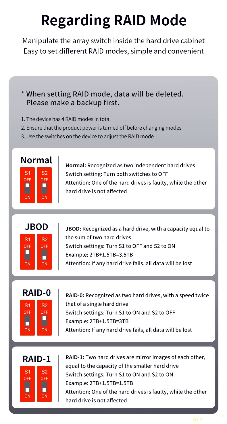 Выбор режима RAID осуществляется с помощью пары микроперключателей на плате контроллера. Какой режим RAID выбрать? Тут каждый решает сам. Комбинация двух переключателей предлагает следующее.
