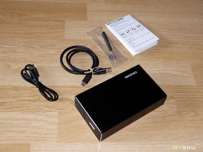 Корпус чертовски красив. Полностью из металла (алюминий, сатин), передняя и задняя планка с фрезерованными гранями. В комплект входит кабель Type-C, отвертка с винтами крепления SSD/HDD, бумажная инструкция и внешний кабель питания. Если будете использовать SSD, то внешнее питание не понадобится.