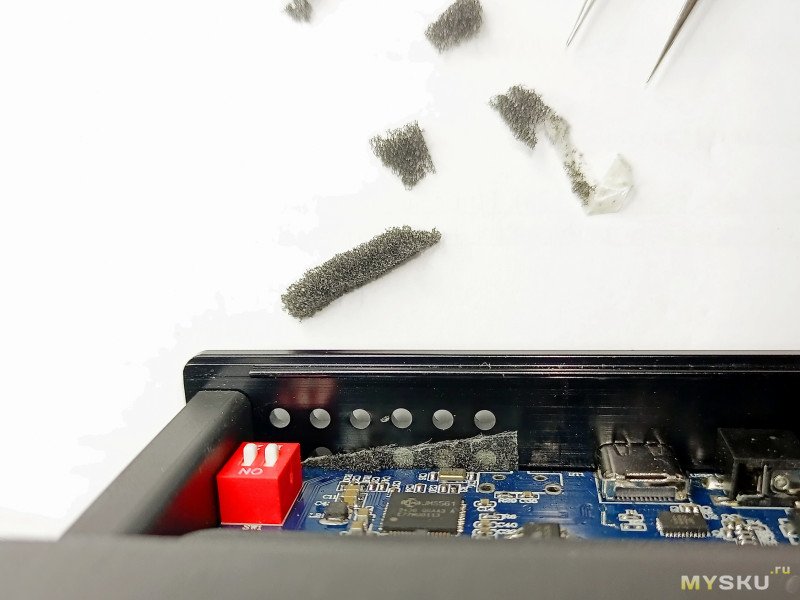 Хуже оказалось другое — вентиляционные отверстия на передней и задней планке тоже были закрыты поролоном. Причем он был наклеен на плотный двухсторонний скотч. В итоге, корпус никак не продувался.