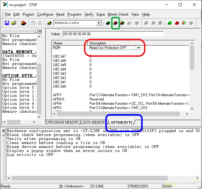 3. Переходим на вкладку „OPTION BYTE“(выделено синим).