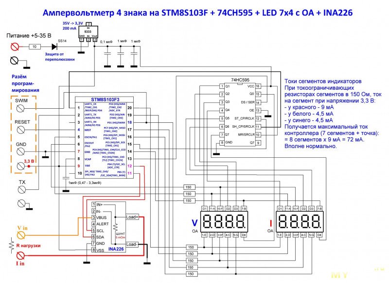 Быстрый и точный 4-разрядный ампервольтметр на STM8S103F3, INA226 и 74HC595