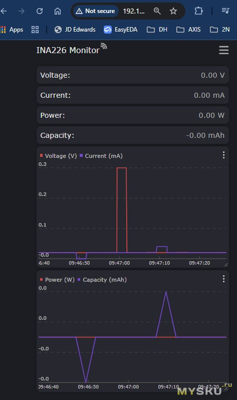 Теперь мы готовы к получению данных о токе и напряжении от INA226. Для получения значения тока, нужно считанное из регистра тока (04h) значение умножить на наш коэффициент К. Это и будет измеренный INA226 ток в миллиамперах. У меня было умножение на 0,5. Если коэффициент у Вас был 1, то ничего умножать не нужно.