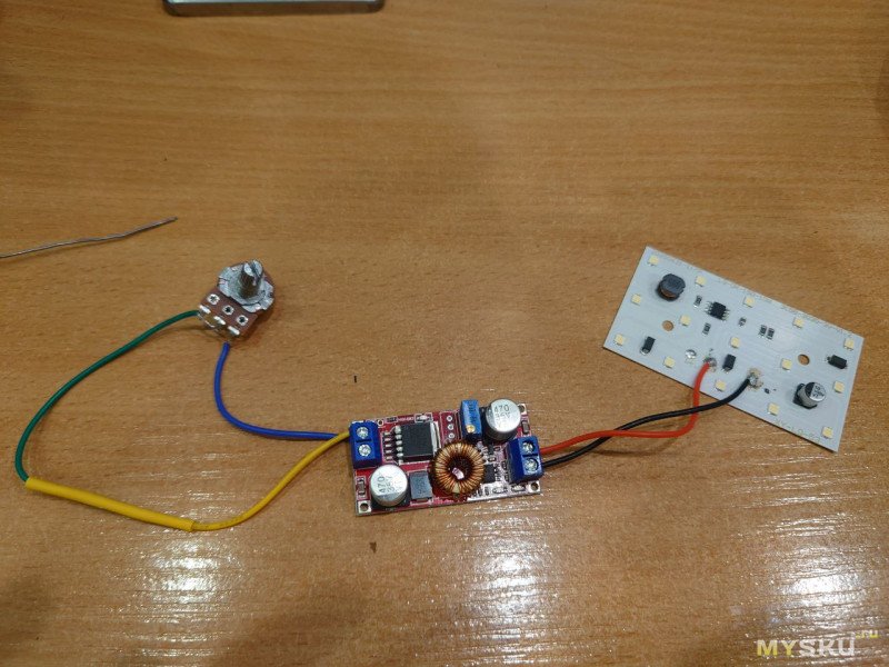 Далее осталось дело техники. Подстроечный выпаиваем, его же можно будет и использовать в качестве постоянного сопротивления, просто накрутить 1,6кОм. Но я взял обычные резисторы что были под рукой 1000 + 500 Ом. Минимальное получилось 1,5кОм при таком сопротивлении получается минимальное свечение, но светодиоды иногда могут немного мерцать (я бы даже сказал мигать), для стабильности свечения лучше брать 1,6кОм. Но мне хотелось иметь в распоряжении выставить минимальную яркость и ток. Потенциометр нужен линейный.
