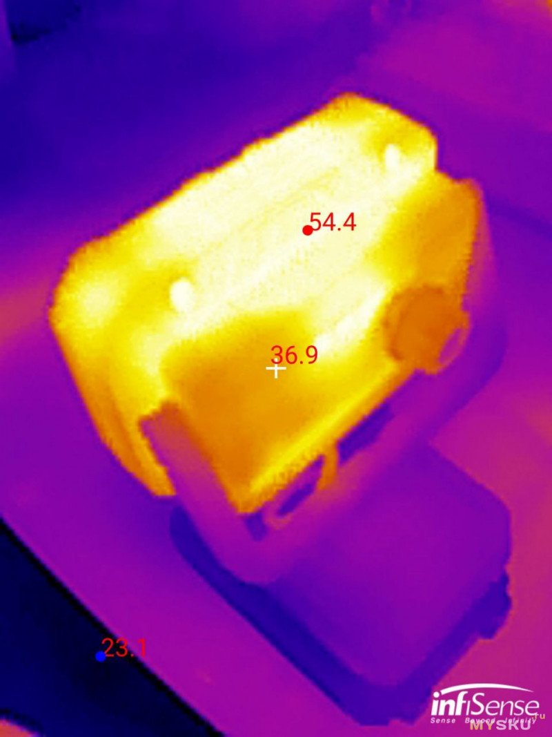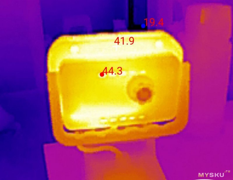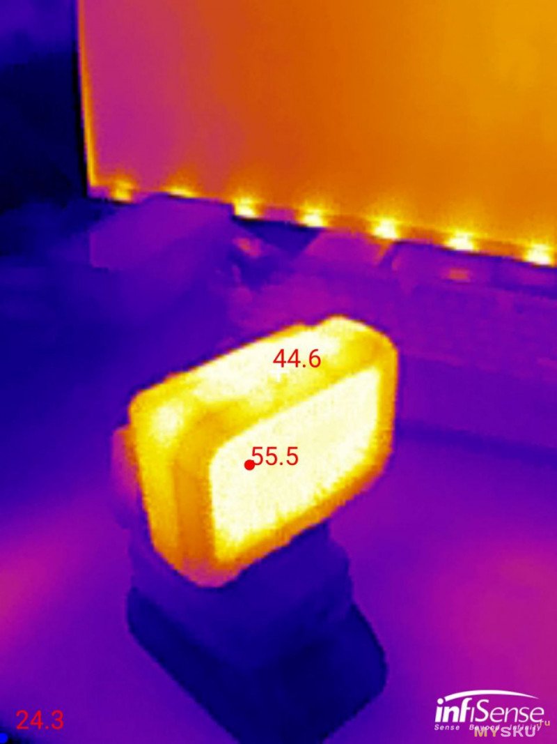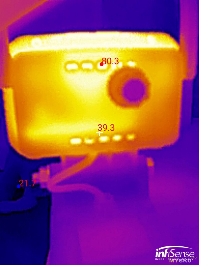 При работе на полной мощности греется прилично, внутри корпуса достигает 80 градусов. Фото через 10 мин.