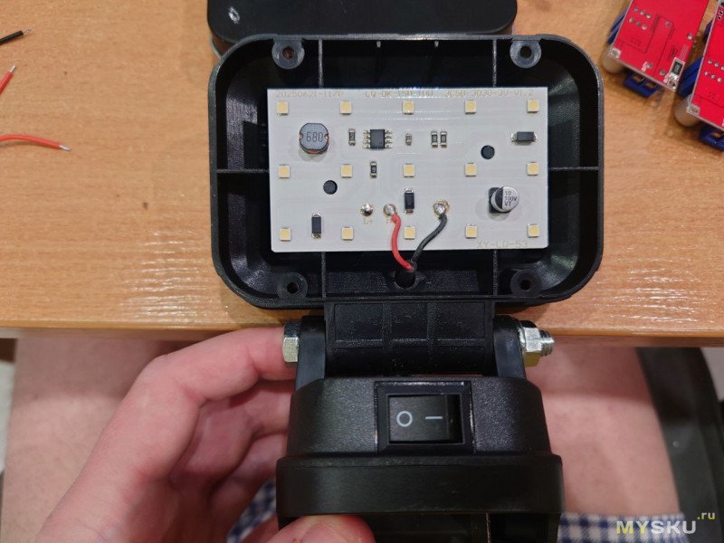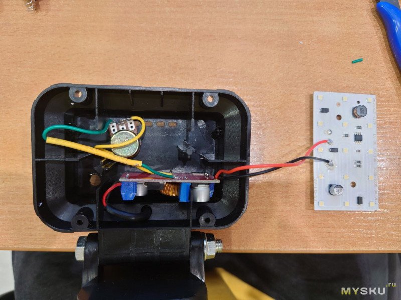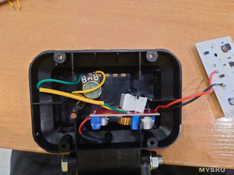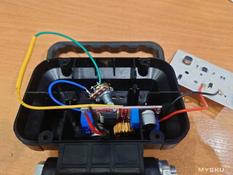 Для сборки выбираем место для потенциометра, сверлим (корпусу это уже не повредит и так много отверстий для охлаждения), прикручиваем. Плату DC-DC я закрепил вставив ребро жесткости корпуса между конденсатором и потенциометром и поджал вспененным ПВХ от какой-то упаковки. Сверху это прижмется платой со светодиодами. Ничего не болтается и не стучит. При желании можно и термоклеем сдобрить.