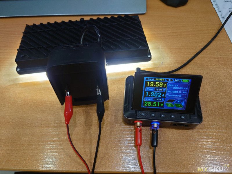 Следующим вариантом сразу проверил понижение напряжения — сработало. Сначала при понижении свечение не падает, драйвер стабилизирует мощность до 12-13V — мощность постоянная 10-11Вт. Но при падении напряжения ниже 12-13V свечение начинает плавно снижаться. К 8V всё отключается, но при этом начинается мигание. Более-менее стабильное свечение от 8.5V. Ток максимум 0.8A (при 13V, при 21V пропорционально меньше).