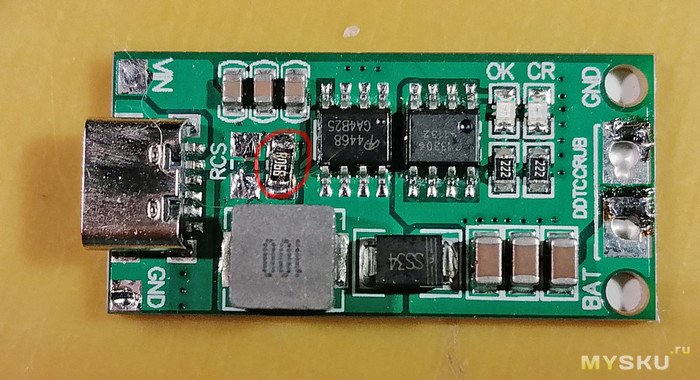На ней есть два светодиода: красный означает что идет зарядка, а синий сигнализирует об её окончании. Плата типа 4S 2A, она черезмерно грелась по моим меркам. Поэтому резистор шунта 0.05 Ом был заменен на 0.068 Ом (на фото обведен красным).