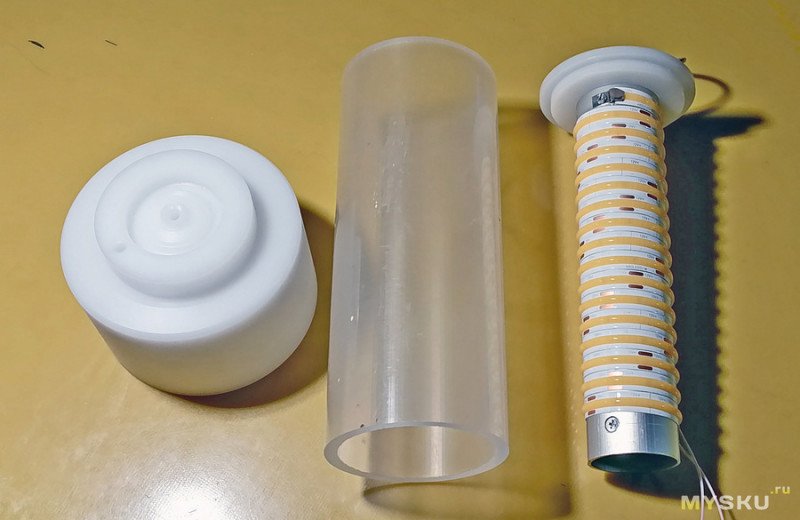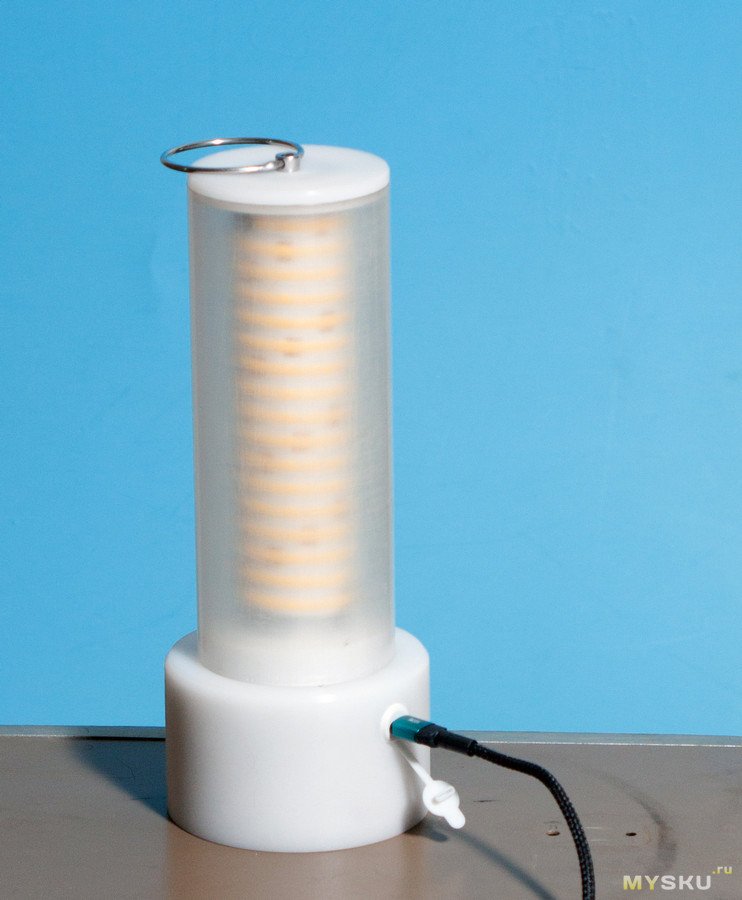 Светодиодная лента наклеена на алюминиевую трубку диаметром 30 мм. На концах трубки внутри вставлены заглушки, в которые закручиваются винты, скрепляющие детали светильника. Детали корпуса светильника выточены из полиацеталя. Верхняя заглушка прикручена винтом, у которого сделано отверстие в головке, в которое пропущено проволочное кольцо. Общая высота светильника 230 мм, без учета этого кольца.