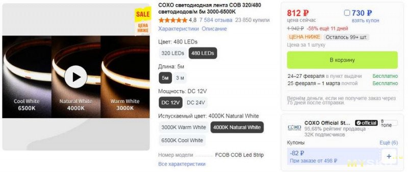 Светодиодная лента на напряжение 12v, нейтральная цветовая температура 4000K: