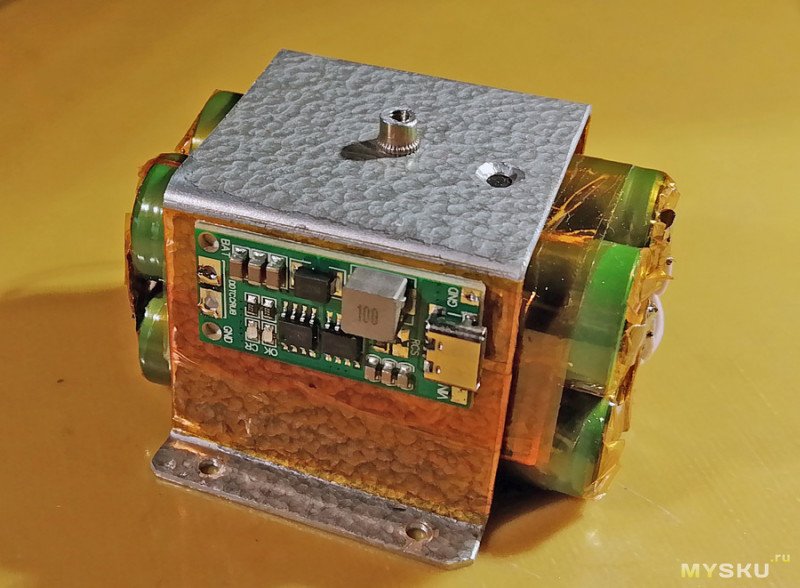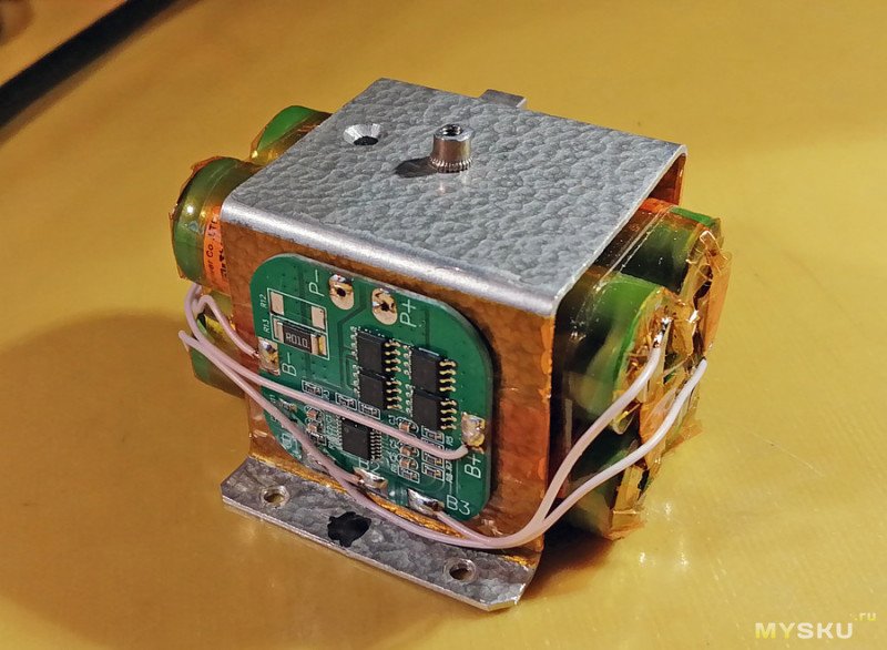 Аккумуляторы 18650 2500 мА*ч в количестве 4 шт соединены последовательно, обернуты каптоновым скотчем, и помещены через резиновую прокладку в П-образную скобу из алюминия. На боковой стенке скобы, на двухстороннем скотче, приклеена плата защиты и балансировки, снятая от отработавшего блока батарей шуруповерта: