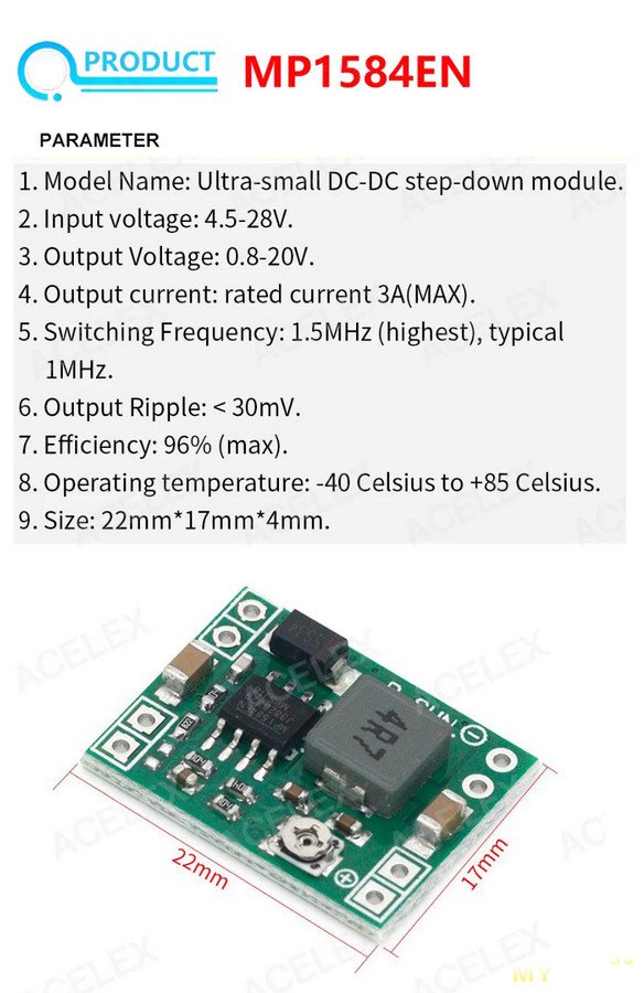 Лента питается стабилизированным напряжением через понижающий DC-DC преобразователь MP1584EN с высоким КПД, и низким перепадом напряжения между входом и выходом: