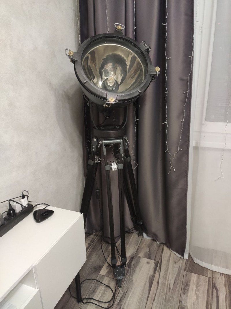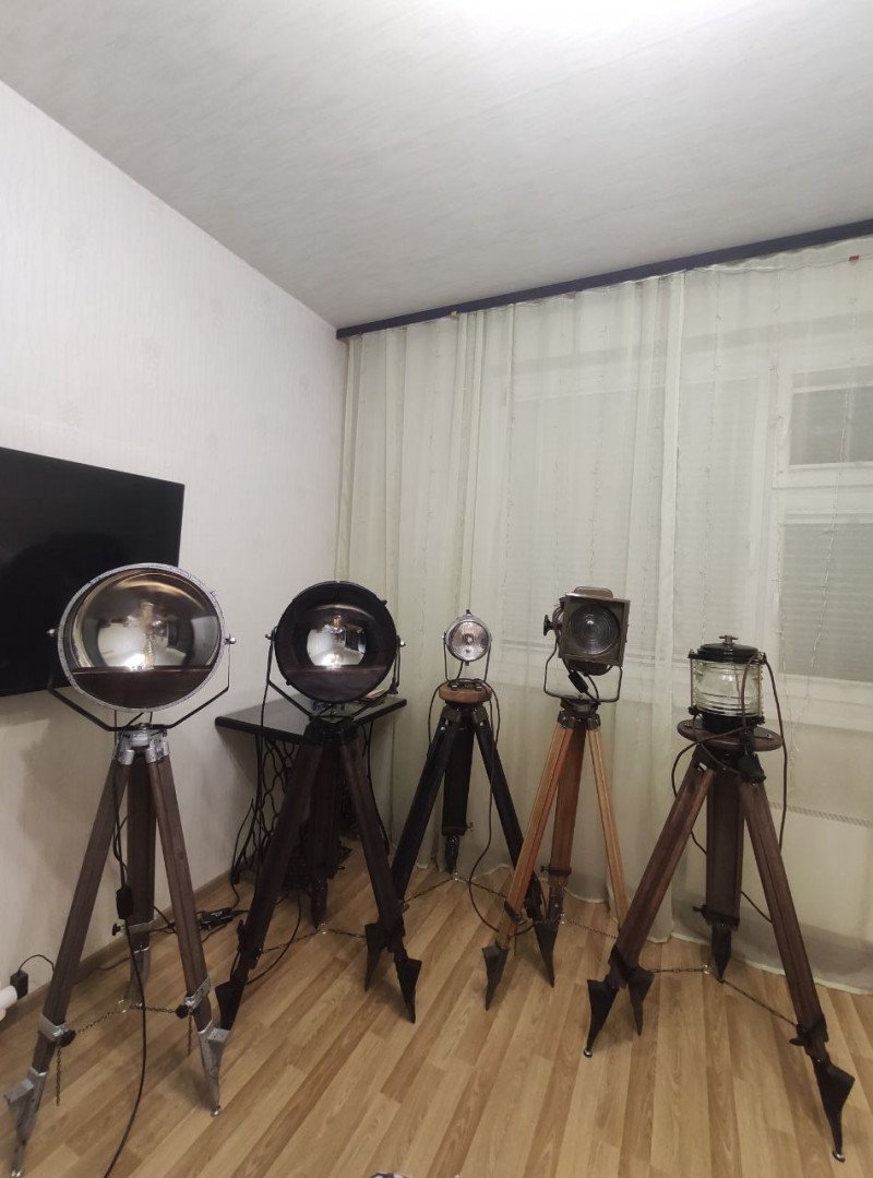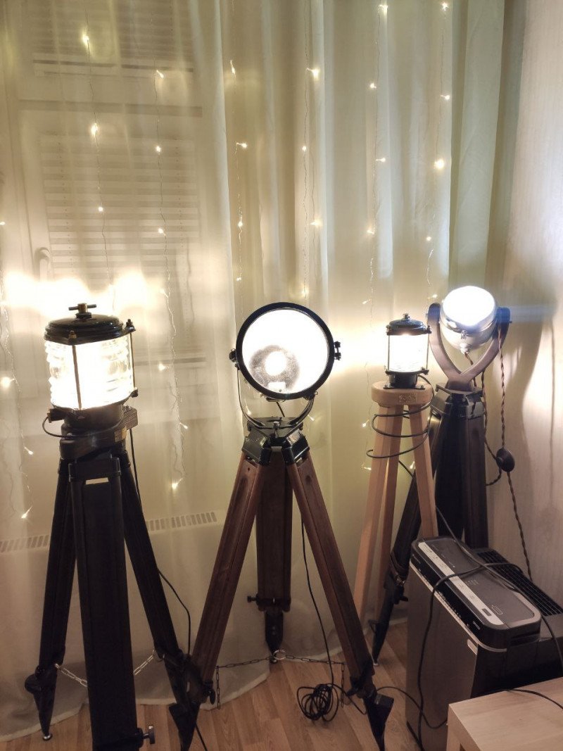 Ну а далее меня было уже не остановить: покупались штативы, лампы, фары, прожекторы, театральные софиты, паровозные светильники, прожекторы с взлётно-посадочной полосы, прожекторы с танков, корабельные прожекторы…Очень круто смотрятся торшеры с использованием корабельной тематики. Особенно топовые фонари. На фото ниже — такие фонари: малый и большой.