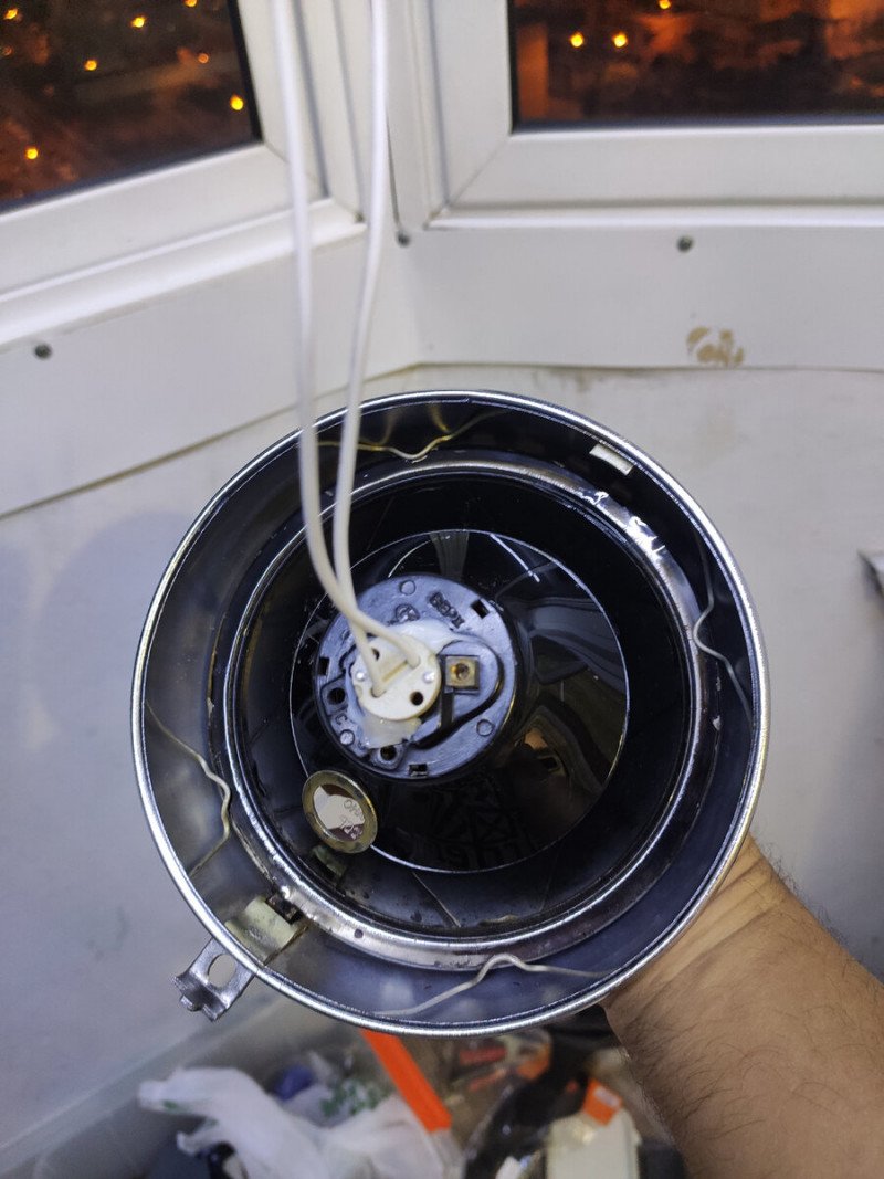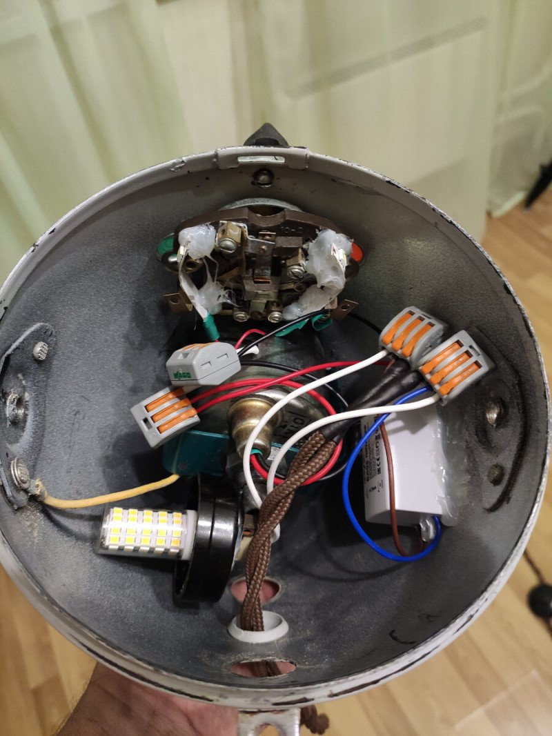 Нашел его на металлоприемке за гроши практически новый. Внутри светодиодная е27, колпачек пришлось отсоединить, чтобы влезла