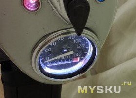 Фара также была полностью разобрана, почищена, помыта, отполирована. Собрал в обратном порядке, но это оказалось неверным решением, так как пришлось придумывать, как подключить питание и сделать подсветку спидометра и индикации.