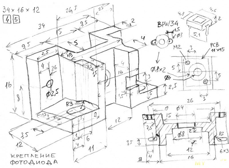 Для механического подключения к движущимся частям станка корпус датчика имеет 6 отверстий с резьбой М3. Чертеж расположения этих отверстий есть в инструкции. Конструктивно это обычные гайки М3, вклеенные в выемки пластикового корпуса.