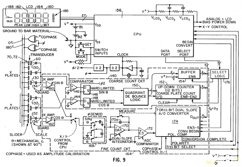 Первым делом линейки разобрал. Внутренности очень похожи на цифровой штангенциркуль – такой же емкостной датчик, выполненный на печатной плате в виде параллельных проводников. Отдельным проводом подключен заземляющий скользящий контакт, который соприкасается с алюминиевым профилем.